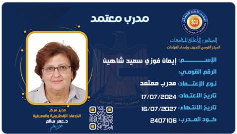 - العمل كمنسقة لقسم الصحة النفسية، إدارة ضمان الجودة بكلية التربية جامعة عين شمس (د.إيمان فوزي سعيد شاهين حاصلة على شهادة مدرب مدربي الجودة TOT من خلال تدريب بإشراف البرنامج الإنمائي للأمم المتحدة UNDP، مشروع تطوير التعليم بالجامعات العربية).