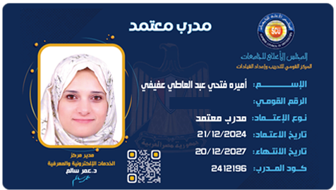 اميره فتحى عبد العاطى عفيفى استاذ الطفيليات الطبيه كلية الطب جامعة المنوفيه ومدير وحة ضمان الجوده بالكليه حصله على مدرب معتمد من المركز الدولى لتنمية قدرات اعضاء هيئة التدريس والقيادات جامعة المنوفيه وقد شاركت فى التدريب من خلال المركز فى عدة حقائب تدريبيه وايضا من خلال وحدة التدريب فى الكليه وفى نقابة الاطباء وغيرها من الاماكن التى تنفذ خطط تدريبيه