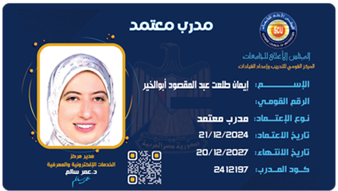 إيمان أبوالخير، مدرس القانون الجنائي بكلية الحقوق جامعة المنوفية، مدرب معتمد من البورد الدولي للمدربين المعتمدين IBCT، ومدرب التنمية المستدامة المعتمد من وزارة التخطيط والتنمية الإقتصادية.
