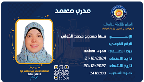 مدرب معتمد بالمركز القومى لتنمية قدرات أعضاء هيئة التدريس والقيادات بجامعة المنوفية