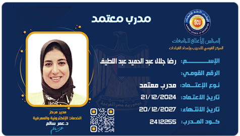 د. رضا جلال عبد الحميد عبد اللطيف. مهندس زراعي اول - كلية الزراعة جامعة الاسكندرية - مدرس بالجامعة التكنولوجية – كلية الصناعة والطاقة –برج العرب. مدرس منتدب بكلية الزراعة البيئية والصحراوية – جامعة مطروح. حاصلة على الماجستير والدكتوراة من قسم الهندسة الزراعية والنظم الحيوية – كلية الزراعة – جامعة الإسكندرية تخصص الآلات والقوي الزراعية. مدرب معتمد من الوحدة المركزية للتدريب على تكنولوجيا المعلومات من المجلس الأعلى للجامعات. حاصلة على شهادة اجتياز برنامج أعداد القيادات الإدارية والتنفيذية رفيعة المستوي لدي مؤسسة القادة للعلوم الإدارية والتنمية من وزارة التضامن الاجتماعي ومعهد العجمي العالي للعلوم الإدارية بالشراكة مع كلية الزراعة –جامعة الإسكندرية.