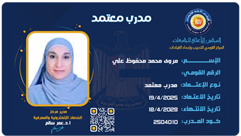 مدرس الأدوية والسموم كلية الصيدلة جامعة المنوفية حاصلة على مدرب دولي معتمد من البورد الدولي للمدربين المعتمدين IBCT ٫ المشرف العام وعضو اللجنة الطبية لعلاج أعضاء هيئة التدريس بالجامعة