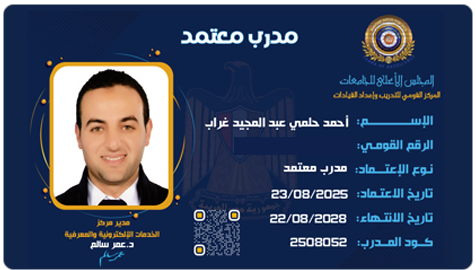 أحمد حلمي عبدالمجيد غراب ، أستاذ مساعد بقسم أصول التربية الرياضية ، كلية علوم الرياضة ، وحاصل علي دورة TOT من المجلس الأعلي للجامعات بجامعة مدينة السادات ومن جمعية إدارات ضمان الجودة التابعة لإتحاد الجامعات العربية ومدير وحدة تكنولوجيا المعلومات بالكلية وحاصل علي دور أساسيات تكنولوجيا المعلومات من أكاديمية سيسكو وحاصل علي البرنامج الاساسى فى مجال الحوكمة و مكافحة الفساد 28-7-2024 من الأكاديمية الوطنية لمكافحة الفساد ، وبلومة الجرافيك ديزاين من البيت الروسي للكمبيوتر متخصص في الترويح الرياضي والبرامج الترويحية لكافة المراحل السنية ، و برامج الترويح وتأثير الأنشطة الترفيهية على الأداء الرياضي، وتاريخ اليوغا في مصر الفرعونية، واستخدام QR Codes في التعليم الميداني عضو في هيئة تحرير مجلة أكاديمية متخصصة في التربية البدنية وعلوم الرياضة والمشاركة في تطوير المناهج، الإشراف على مشروعات التخرج، والتدريب الميداني للطلاب ومشرف تنفيذ الدورات بمركز تنمية القدرات للقيادات وأعضاء هيئة التدريس بالجامعة ومنسق التدريب والإستشارات بمركز التدويل والمشاركة العالمية بجامعة مدينة السادات .