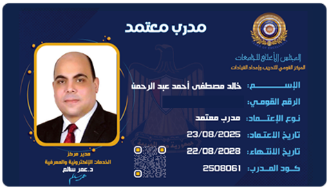خالد مصطفى أحمد أتقلد منصب مدير عام كلية الهندسة بشبرا جامعة بنها وحاصل على ماجستير في المحاسبة والمراجعة كلية التجارة وبكالوريوس تجارة شعبة محاسبة وبكالوريوس علوم حاسب. ودوره فى تطبيق المعايير المطلوبه فى التقييم الذاتى والمراجعه الخارجيه 2013. دوره فى تطبيق المعايير المطلوبه فى االمراجعه الخارجيه 2013.دورة صناع القرار رقم 6 بأكاديمية ناصر العسكرية2018.دورة الأزمات والتفاوض رقم 17 بأكاديمية ناصر العسكرية 2018.دورة الدراسات الإستراتيجية والأمن القومي رقم 34 بأكاديمية ناصر العسكرية 2018.ورشة عمل هيئة الداد الالمانية DAAD بالقاهرة في ورشة عمل العمل الجماعي وادارة الوقت 2018 بترشيح من جامعة بنها.ورشة عمل هيئة الداد الالمانية DAAD بالقاهرة في ورشة عمل تدويل مؤسسات التعليم العالي2018.ورشة عمل هيئة الداد الالمانية DAAD بالقاهرة في ورشة عمل إعداد هيئات التعليم العالي إدارياً 2018.ورشة عمل هيئة الداد الالمانية DAAD بالقاهرة في ورشة عمل إدارة مؤسسات التعليم العالي 2018.دورة القيادات "مدير عام" من الجهاز المركزي للتنظيم والإدارة – رئاسة مجلس الوزارة 2020.تمثيل جمهورية مصر العربية فى جامعة هوبى لمدة شهر فى سيمنار عن الاقتصاد وادارة الاعمال فى جمهورية الصين الشعبيه بالتعاون بين وزارة التعليم العالى ووزارة التعاون الدولى وجمهورية الصين الشعبية 2010.مدير عام كلية الهندسة بشبرا جامعة بنها من أكتوبر 2020 بقرار وزاري رقم (971) لسنة 2020 ولمدة خمس سنوات حتى الأن بقرارات وزاريه.أجادة اللغة الإنجليزية. واجتياز IELTS من المركز الثقافى البريطانى.الرخصة الدولية ICDL لقيادة الحاسوب من المركز الدولي للغات وعلوم الحاسب بالجامعة الأمريكية بالقاهرة ( AUC).المشاركة فى اعتماد برامج كلية الهندسة بشبرا من الهيئة القومية لضمان جودة التعليم والأعتماد ، لجميع برامج الكلية وعددها (14) برنامج 2003.دورة TOT1 (المدرب المشارك) من مركز تنمية قدرات أعضاء هيئة التدريس والقيادات – جامعة بنها الفترة من 16-12-2023 إلى 19-12-2023دورة القيادة والتأثير من مركز تنمية قدرات أعضاء هيئة التدريس والقيادات – جامعة بنها الفترة من 3-2-2024 إلى 5-2-2024.دورة أساسيات التحول الرقمى 12/2/2024