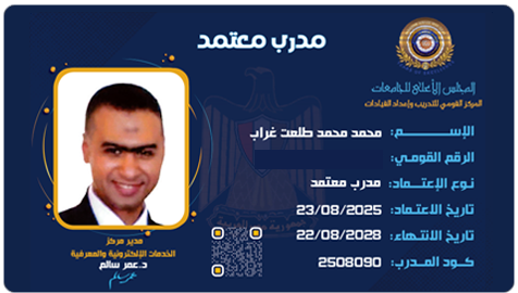 الحصول علي العديد من الدورات التدريبية في الدراسات المستقبلية -مهارات الاتصال والعرض الفعال -أساليب البحث العلمي -الكتابة العلمية -أستخدام التكنولوجيا في التدريس - التحول الرقمي وتدريب المدربين