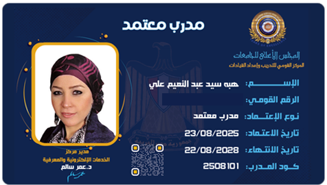 مدربة معتمدة TOT من المجلس الأعلى للجامعات، تقدم برامج تدريبية متقدمة لتطوير الكفاءات الأكاديمية والمهنية للطلاب وأعضاء هيئة التدريس.