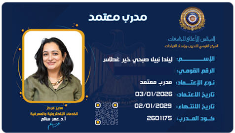 حصلت على دورة إعداد المدربين (TOT) بجامعة بورسعيد عام 2025، وتم اعتمادها كمدرب بالمركز القومي لتنمية قدرات أعضاء هيئة التدريس والقيادات، مما أتاح لي المساهمة في إعداد برامج تدريبية تستهدف تطوير مهارات أعضاء هيئة التدريس ومعاونيهم في مجالات التعليم الرقمي والتعلم المدعوم بالتكنولوجيا.